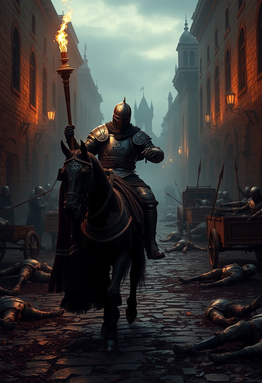 lone heavily armored horseman crusader with a torch walks in medieval city with corpses stockpiked on the streets and in carts, horse is wearing heavy armor, twilight