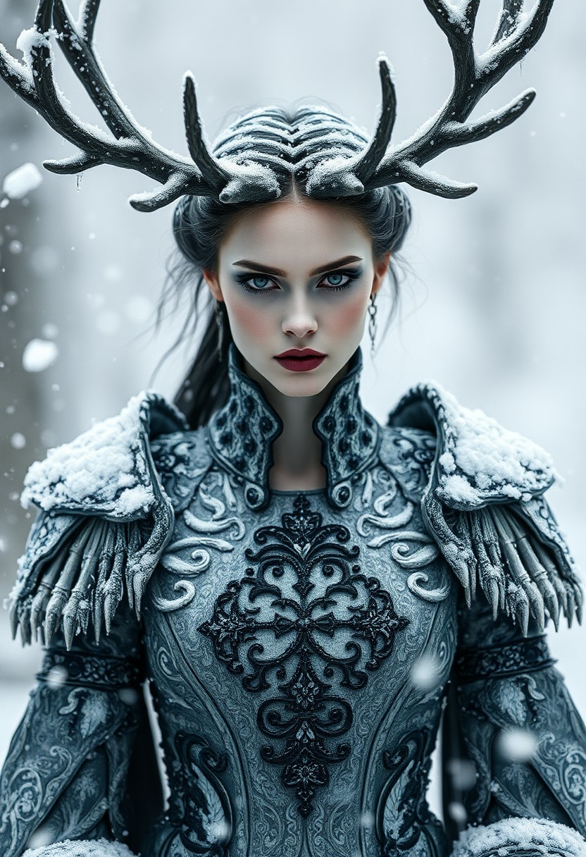 The image portrays a photorealistic, ethereal figure that blends elements of nature and fantasy, embodying the essence of a winter deity or forest spirit. The central figure is a woman with pale, almost ice-like skin, her face striking and defined by sharp, otherworldly beauty. Her eyes are dark and haunting, accentuated by black makeup that creates a stark contrast to her frosty complexion. Her expression is calm yet powerful, exuding a commanding presence. She wears a regal, intricately designed gown, adorned with frosted patterns and icicles, as though her attire is woven from the very essence of snow and ice. The fabric of her garment seems to blend seamlessly into the swirling snow around her, giving the impression that she is part of the winter storm. Her chest is highlighted by an elaborate, darkened emblem or symbol, adding to her mystical aura.The most striking feature is the large, dark, tree-like antlers that grow from her head, coated in snow and frost, further connecting her to nature and the wilderness. These antlers give her a majestic, almost animalistic quality, as if she is the embodiment of winter itself. Snow swirls around her, with branches and ice shards blending into the stormy background, enhancing the cold, wintry atmosphere. The dark, stormy ambiance adds to the sense of her being a powerful, elemental force..(8k, RAW photo, best quality, ultra high res, depth of field:1.1), (absurdres, intricate, photorealistic, masterpiece, ultra-detailed)