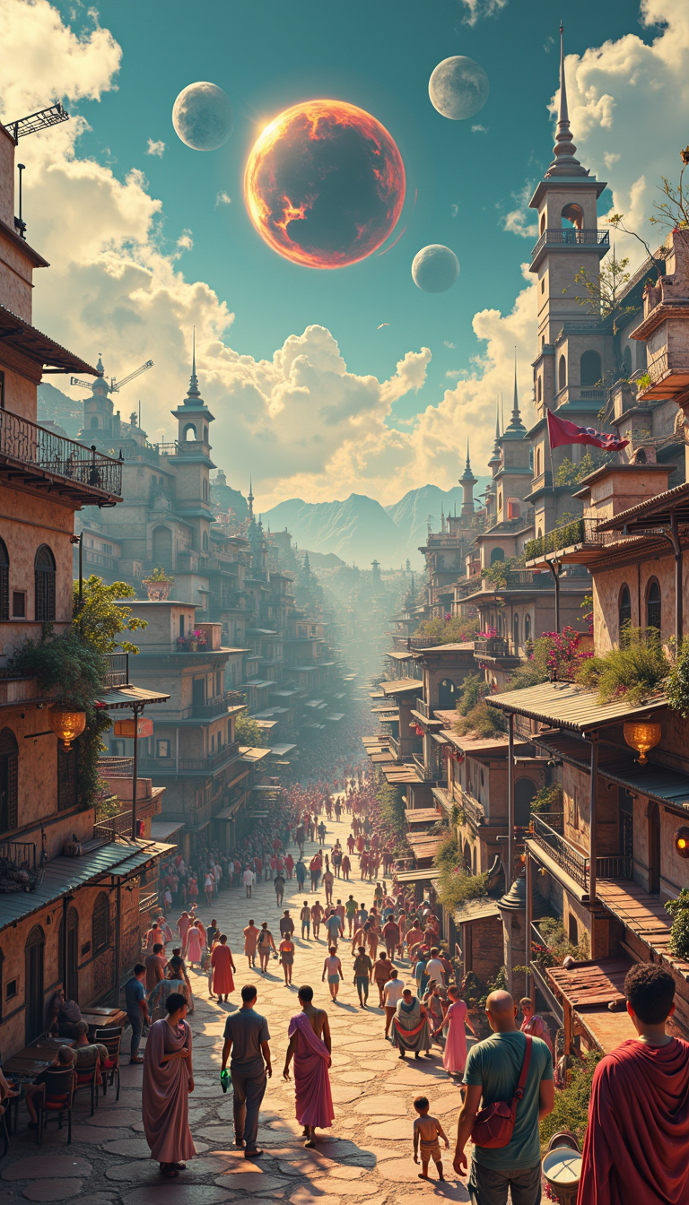 An intricate, panoramic view of a "time refugee camp" where displaced individuals from various eras coexist. Show a sprawling settlement with diverse architectural styles reflecting different historical periods and potential futures. Include scenes of cultural exchange: a Victorian lady learning about smartphones from a teenager, Roman legionnaires playing basketball with 1980s hip-hop artists, and futuristic scientists examining medieval artifacts. Depict the challenges of this temporal melting pot, such as a communal dining area serving historically accurate meals from multiple centuries. The sky should show a surreal blend of time periods: a partial eclipse, multiple moons, and anachronistic air traffic. Use a color palette that subtly shifts across the image, representing the flow of time, with each era retaining its characteristic hues.