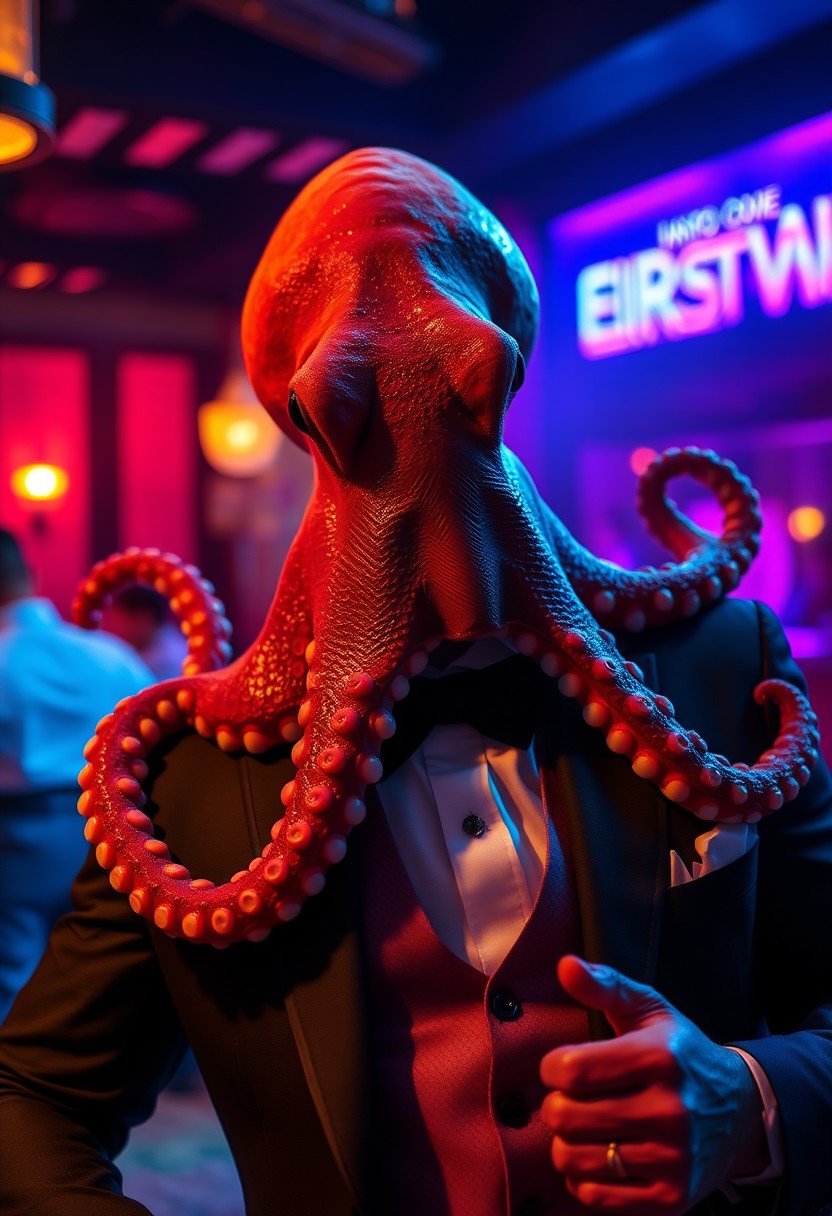 Cinematic. A dashing octopus. wearing a debonair suit, an enigmatic smile , a dynamic pose, one of class and sophistication. a gritty photograph, professional photography, in cocktail lounge. multicolored lighting. fantastic, exotic, adventurous. exciting,