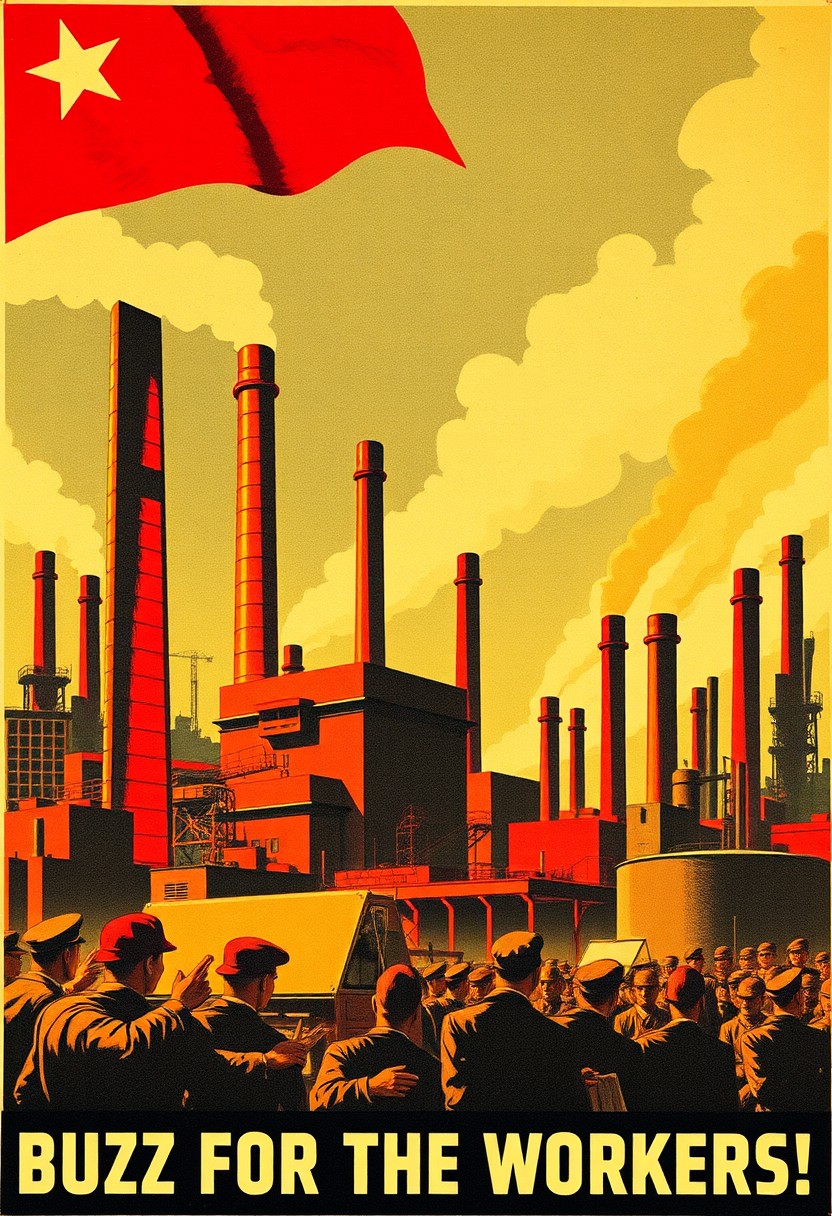 Soviet propaganda poster, communism, industry, proletariat, subtitled “BUZZ FOR THE WORKERS!”