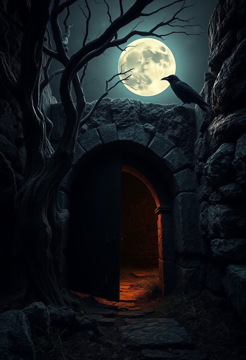 high focus angle, entrance of an ancient, forgotten crypt, under the light of a full moon, with a raven perched ominously on a gnarled tree nearby.