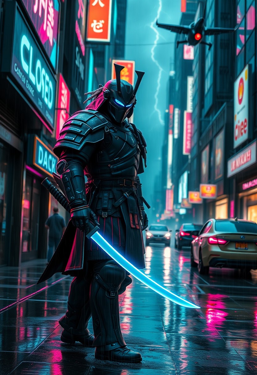 An armored cyberpunk samurai stands in a rain-soaked alley, his katana glowing with a neon-blue edge. Behind him, the towering futuristic city is filled with neon signs and holographic billboards. His mechanical arms flex as he prepares for battle, steam rising from the rain hitting his armor. The scene is filled with electric colors—pink, blue, and purple—reflected on the wet street, as flying cars zoom overhead. The sky is dark, and distant thunder echoes through the city.
