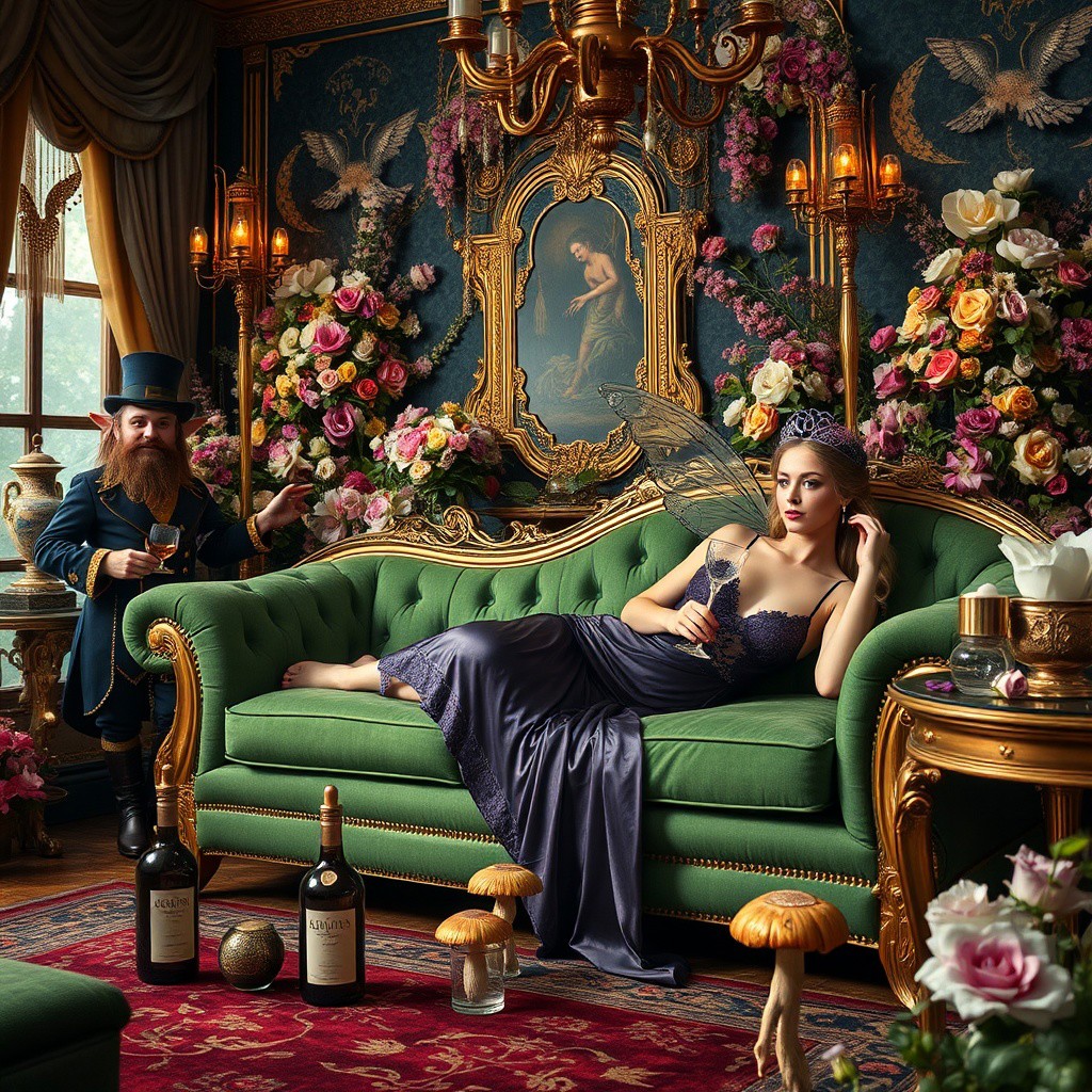 The flashy decoration, the luxurious interior of extravagance, the room full of decorative arts, flowers filling every space, a Fairy queen lying on the green chase lounge with a goblet, wearing a tight purple lace night gown, a leprechaun waiter standing in the corner, silk and satin clothing, two potion bottles and mushrooms on the ground, the focus is on the woman on the sofa, navy blue and gold tones,