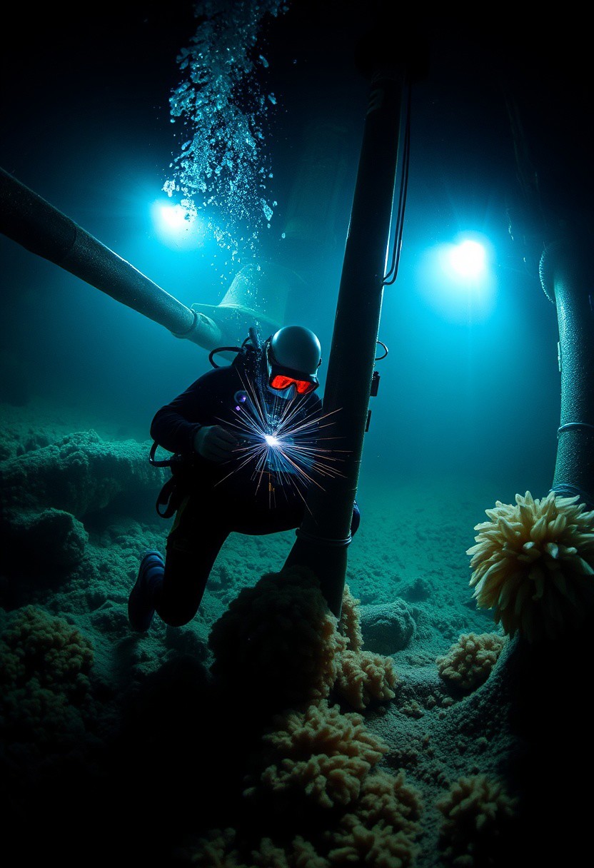 underwater documentary photograph of a saturation diver welding vertical oil pipelines of a drilling rig at the bottom of the ocean, the ocean floor is delicate and bursts into muddy clouds around the legs of the man, a couple of curious deep water fishes wander around, high pressure bell in the visible background, lit by two strong construction lights surrounded by total deep depth darkness