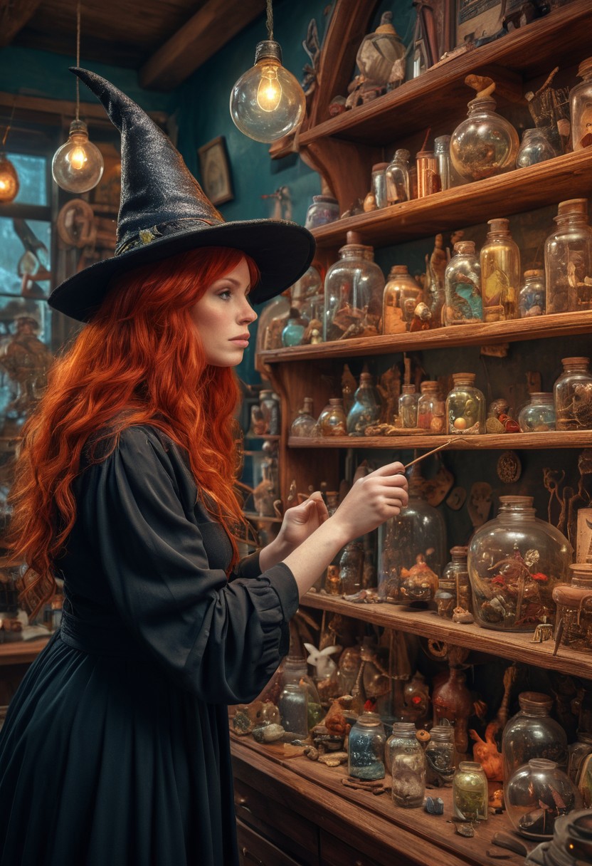 A red haired witch inspecting a magical, mysterious, wonderful, shop of curiosities. colourful, imaginative, realistic