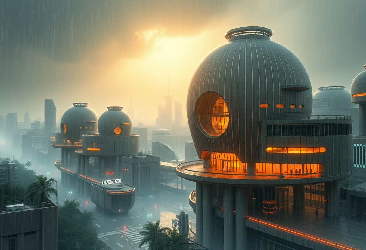 Breathtaking masterwork digital photo, sci-fi city, sleek organic rounded laminate architecture, heavy blinding rainstorm