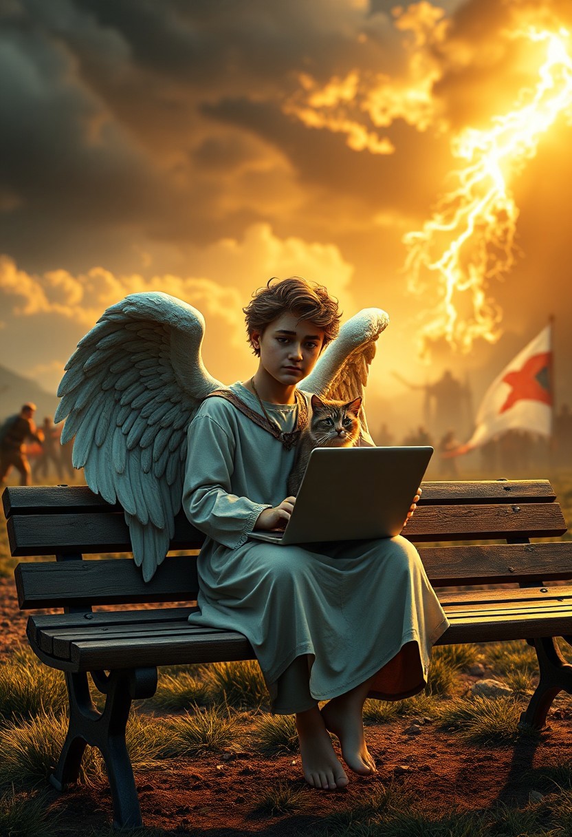 Angel sitting on bench The angel has a disappointed but content expression, he got a laptop on his lap and a cat cuddled on his shoulder. (((In the Background, The final battle between Light and Darkness rages on the ground and in the heavens.))) Photo-realism, sun rays, dynamic volumetric shadows, 4k UHD, perfect details, Accurate representation