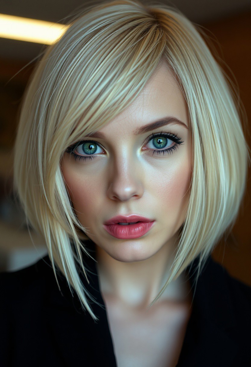woman, blonde bobcut hair, parted half hair, green and blue eyes, eyeliner, deep drag,