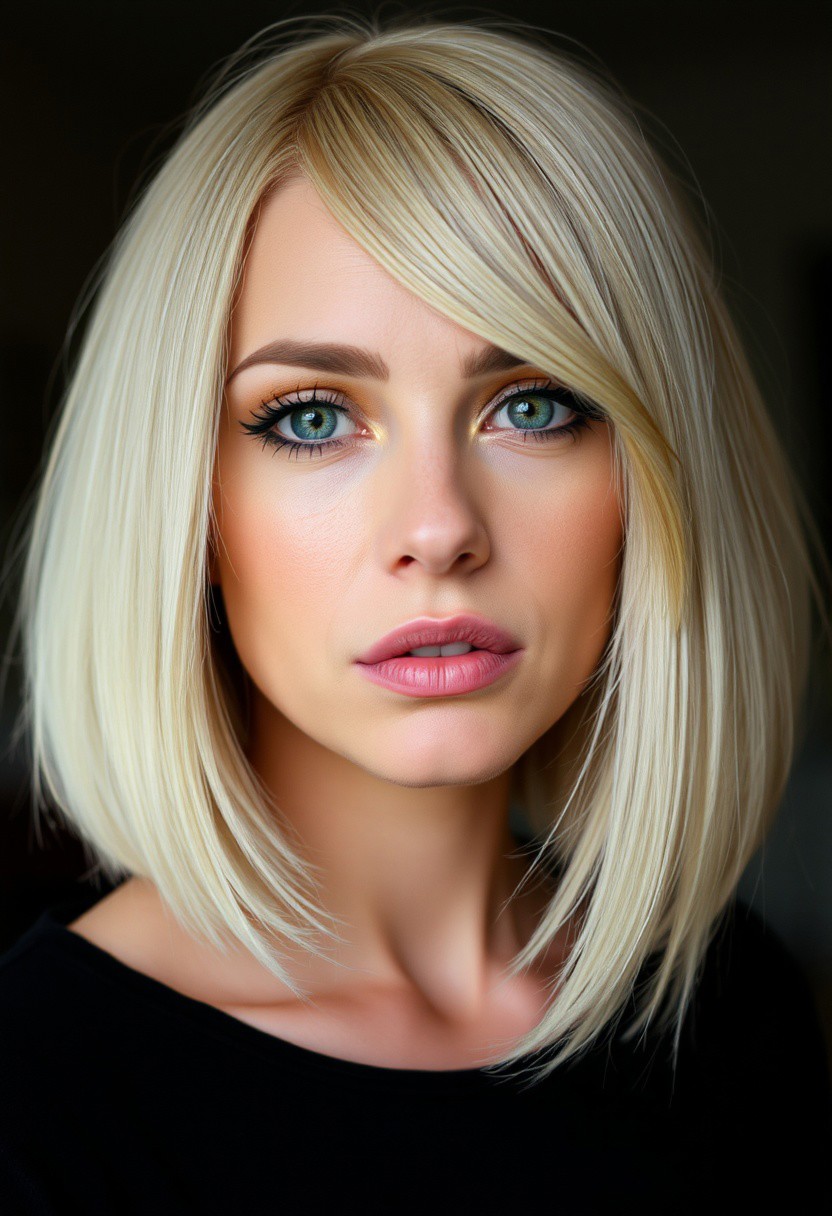 woman, blonde bobcut hair, parted half hair, green and blue eyes, eyeliner, deep drag,