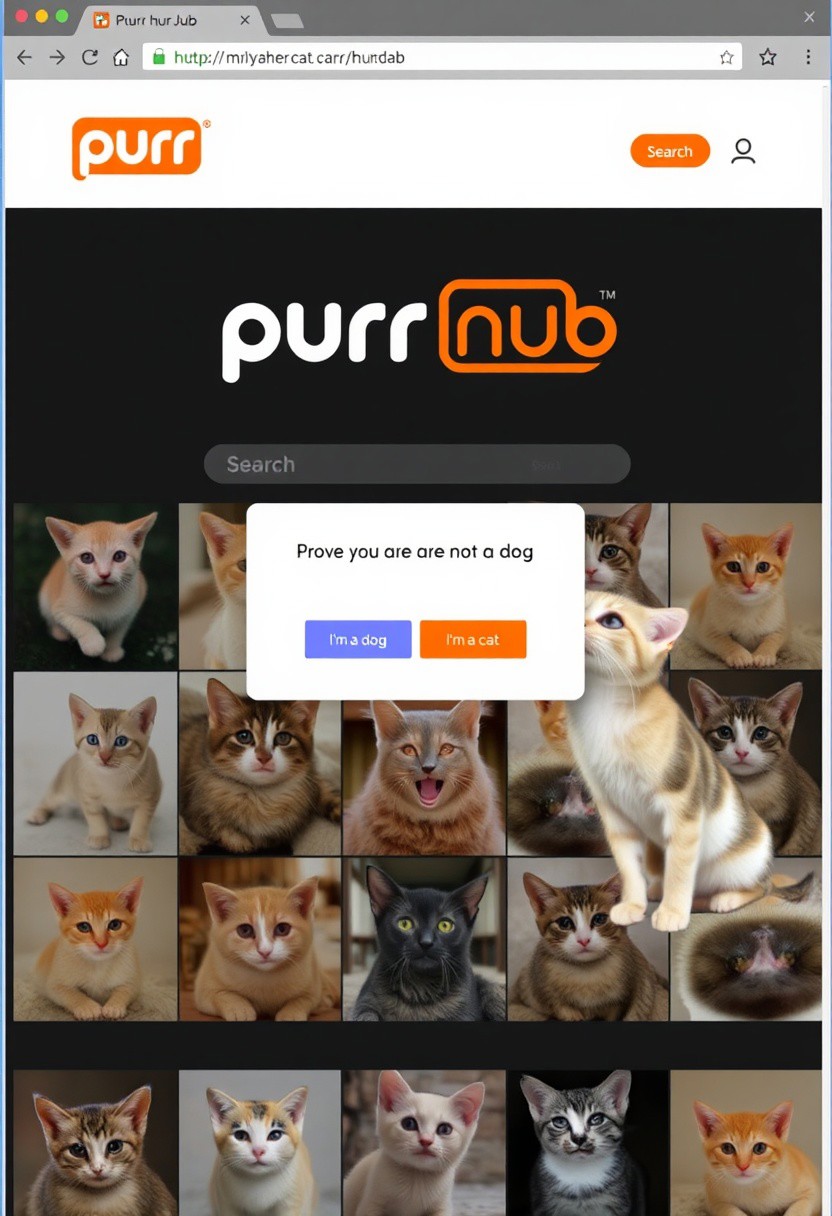 Screenshot from the most famous cat photo website, "Purr Hub", the logo is a name itself "purr" in white font and "hub" in black font, "hub" is inside an orange rounded rectangle. The website has a dark theme and shows a grid of photographs of various cute cats. a cute kitten stands next to the search bar. in the center of the page is a popup captcha window that reads "Prove you are not a dog" with two option buttons "i'm a dog" "i'm a cat".