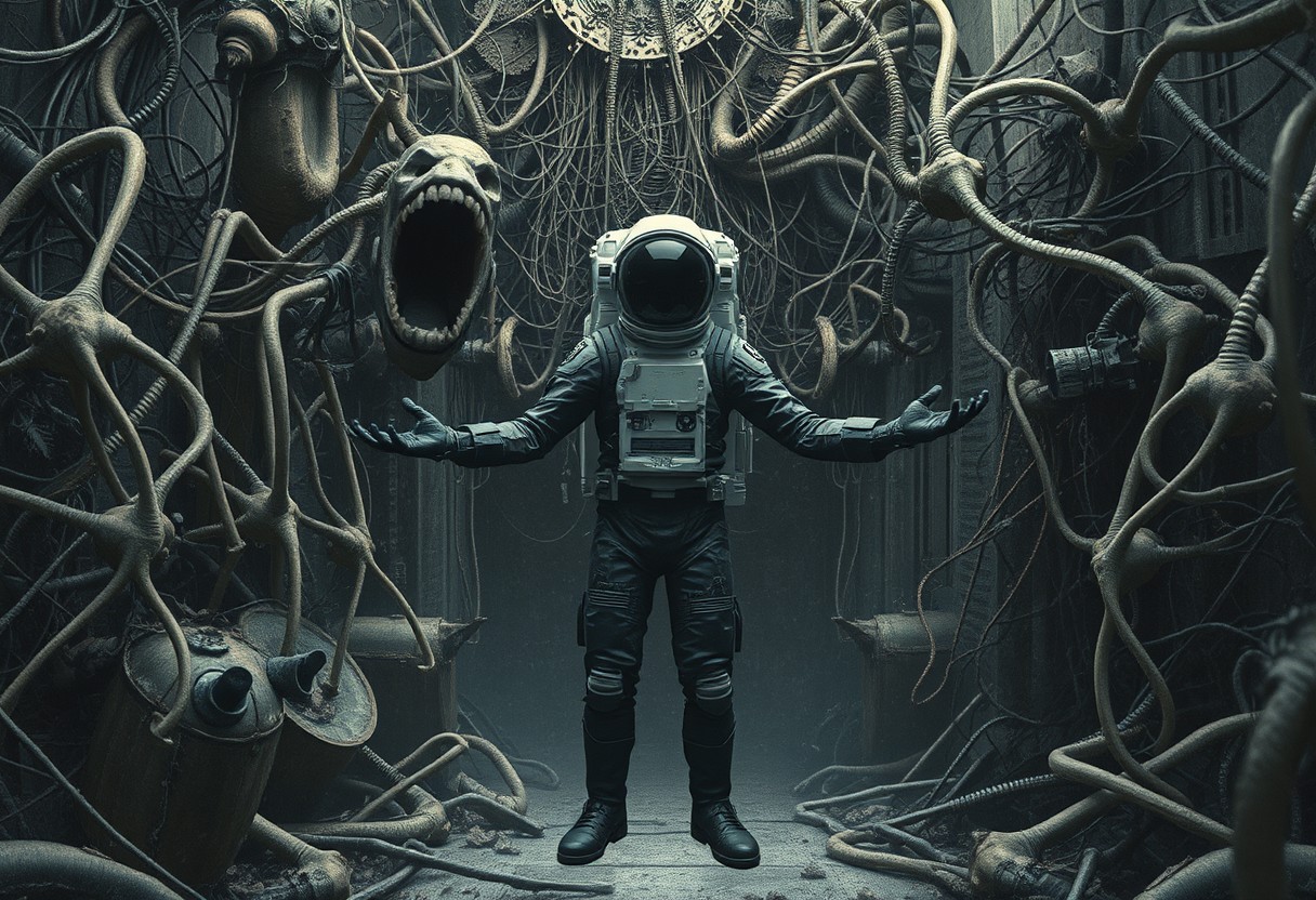 A lone astronaut stands amidst a chaotic fusion of organic and mechanical elements, enveloped in a dense web of twisted metallic and skeletal structures. The scene captures a surreal blend of sci-fi and dystopian aesthetics, reminiscent of impressionist styles with an emphasis on raw textures and dramatic contrasts. The color palette leans heavily on shades of gray and muted earth tones, interspersed with hints of glimmering silver and deep shadows, creating a haunting, otherworldly atmosphere. The astronaut, clad in a sleek, dark suit with visible intricate details, extends their arms towards the menacing tangle of wires and bones that dominate the background, hinting at a complex relationship between man and machine. The composition evokes a sense of isolation and intrigue, inviting viewers to ponder the narrative behind this eerie, mechanized environment.
