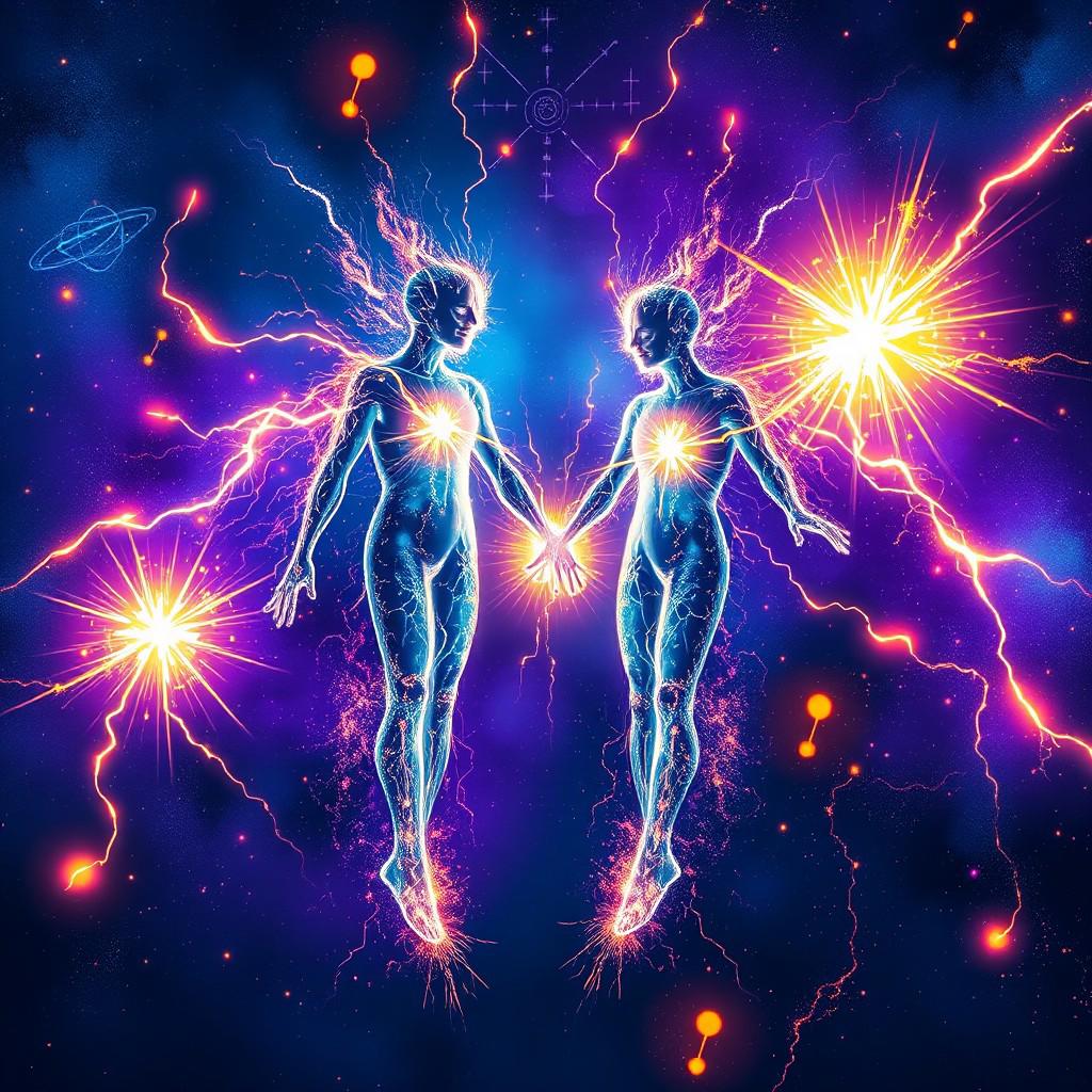 A dynamic, surreal image of two figures connected by glowing electric currents, symbolizing the pulse of energy between them. Their bodies are surrounded by vibrant particles, representing matter and chemistry, floating in a vast, cosmic space. Explosions of light radiate from their hearts, mirroring the 'cosmos in the chest' line. The background is filled with abstract shapes and scientific symbols like atoms, molecules, and wave patterns, adding a futuristic and electric vibe. The overall color scheme is deep blue and purple, with bright flashes of electric yellow and white, capturing the intensity of their connection.