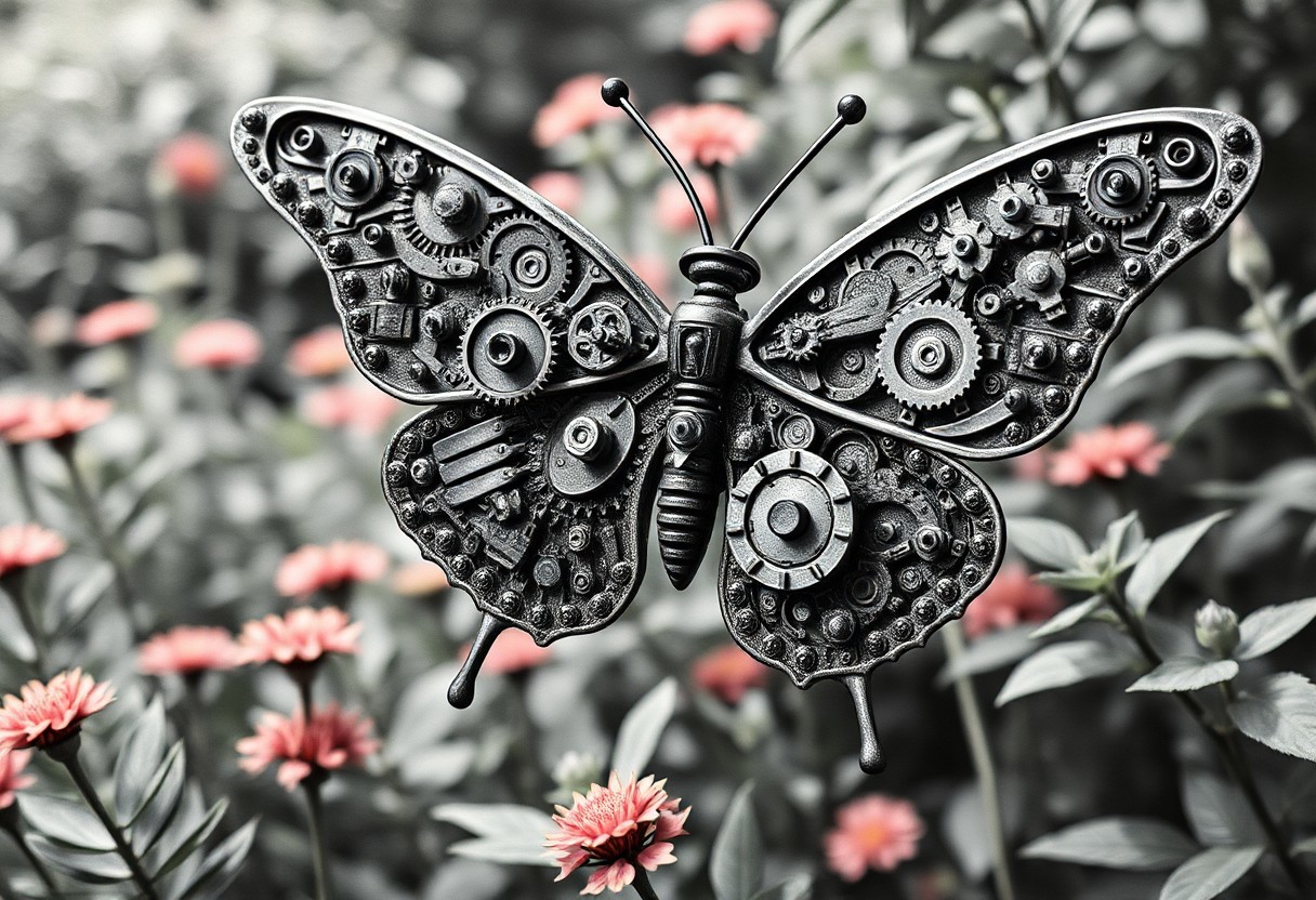 A close-up of a butterfly made entirely of intricate gears, cogs, and metal plates, yet it moves with the grace and beauty of a real butterfly. The background is a lush garden where the contrast between nature and machine is highlighted, pencil shading,charcoal drawing,tinted paper,pencil drawing,brutal dark b/w color scheme,A striking ultra HD charcoal drawing,overall composition is a perfect balance of intricate and insanely detailed elements