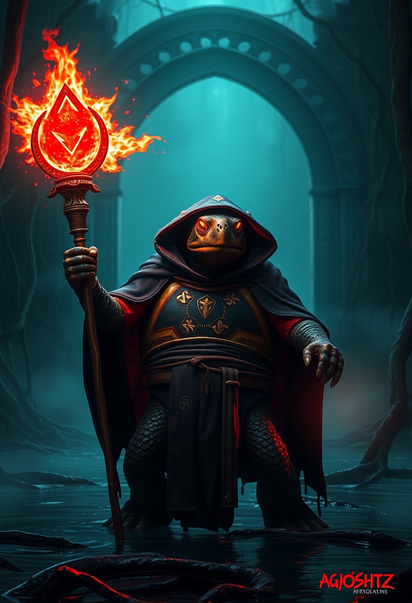 "Create a hyper-realistic image of a turtle shaman standing guard at the water gates of a holy sanctuary in the swamp. The shaman wears a dark, hooded robe enchanted with mysterious symbols, and holds a staff with a glowing red magic jewel on top. The jewel pulses with a bright red holy light, erupting in a powerful fireball that blasts outward at incredible speeds. The turtle's eyes glow with an inner intensity, ready to defend the gates against all threats. The swampy environment is dark and foreboding, with twisted roots and mist-shrouded waters. The atmosphere is ominous and foreboding, with a sense of ancient, primal power." Octane render, Highest-Quality, 8 k, intricate details, visually stunning, Masterpiece