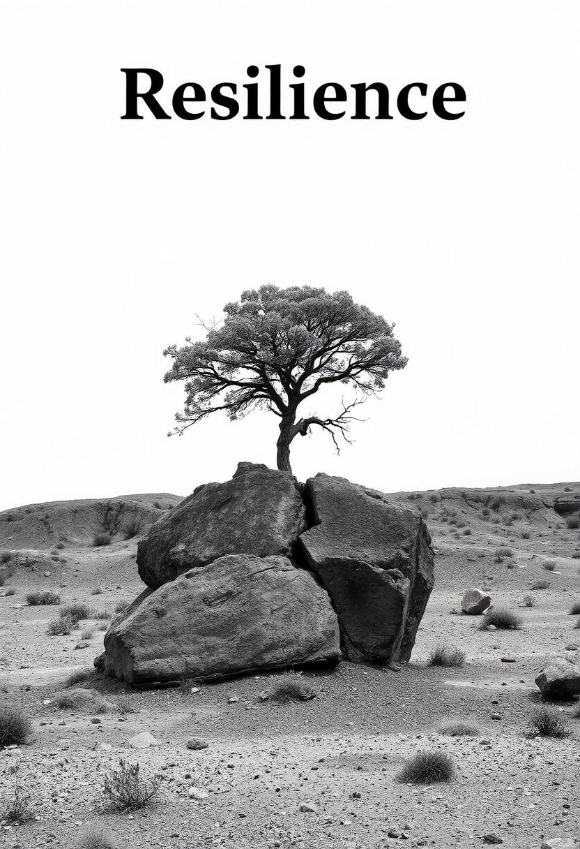 A black-and-white photograph of a lone tree growing through a crack in a solid rock, towering over the barren landscape. The word 'Resilience' is written at the top in a strong, bold font.