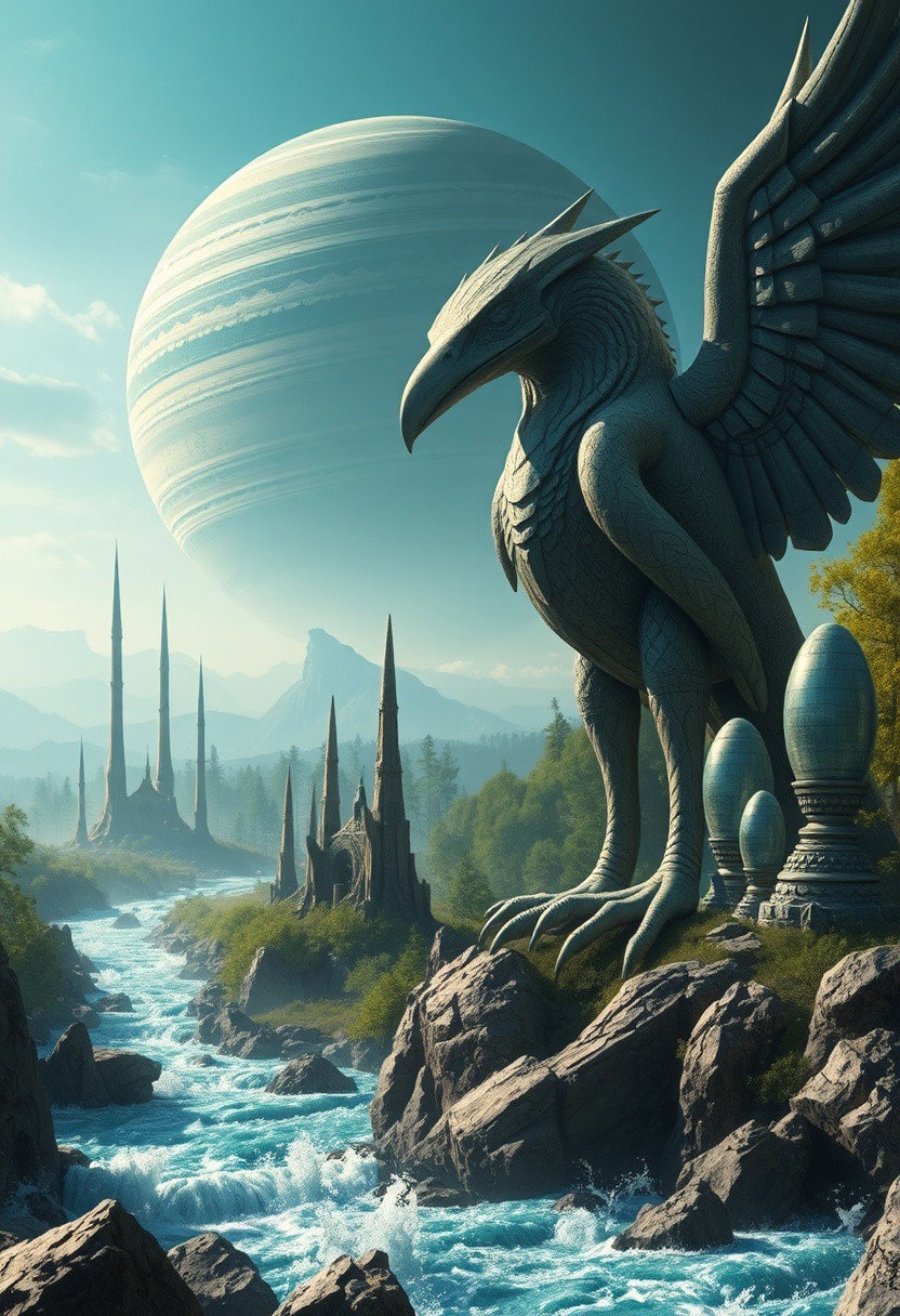 a giant alien, avian statue, with a sharp beak and eagle eyes, its clawed feet astride a fast flowing blue river with spray rising from jagged rocks, guards a valley. In the near distance several structures, tall narrow spires topped with large egg shaped crystal houses. On the horizon a giant ringed planet, its atmosphere a swirl of blues and greens, rises over an alien forest