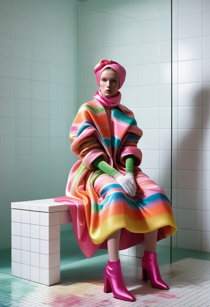 The image is a photograph taken indoors, likely in a modern, possibly institutional setting, such as a gallery or a fashion studio. The subject is a person standing in front of a window with white frames, which lets in natural light, illuminating the scene. The person is dressed in an avant-garde outfit that combines multiple textures and colors. They wear a large, voluminous coat with a pink, translucent fabric featuring a small, intricate pattern of white flowers. The image is a photograph featuring a person sitting on a white tiled bench in a shower or bathroom setting. The individual is dressed in a striking outfit with a vibrant color scheme of pink and green. They are wearing a bright pink satin headscarf that covers their face, obscuring their features, and a matching pink satin glove on their right hand. The glove extends up to their elbow, adding to the surreal, almost otherworldly appearance. This photograph showcases a striking, avant-garde fashion display featuring a vibrant, multi-colored, abstract textile piece. The central figure is a mannequin dressed in a fantastical, oversized, floor-length gown made of a textured, colorful fabric. The gown is adorned with bold, bright stripes in shades of blue, green, yellow, and orange, creating a psychedelic effect. The fabric appears to be a mix of wool or a similar material, giving it a fluffy, textured appearance.