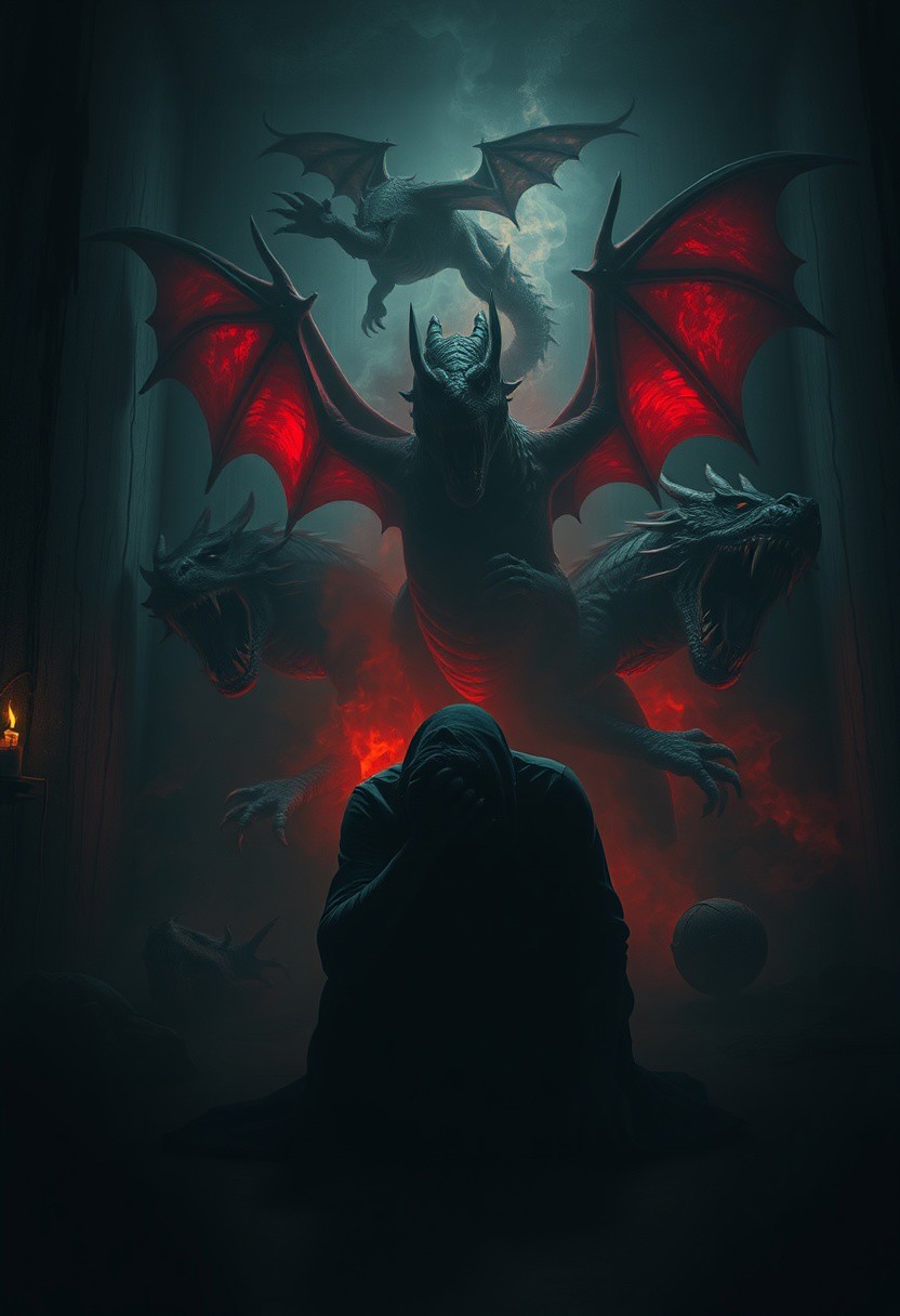 In a dark, oppressive room with the light barely flickering, a shadowy figure sits, head buried in their hands. Heavy thoughts swirl around like a storm, nightmares filled with visions of war and deceit. Dragons rage in the background, their fire lighting up the scene with an ominous red glow. Twisted creatures with sharp teeth lurk in the shadows, ready to bite. The room itself feels like it's alive, the walls oozing and shifting as if breathing with the darkness, trapping the figure in a relentless cycle of terror.