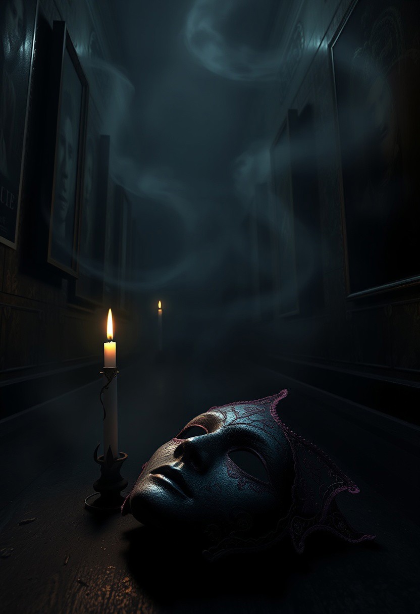 vicgoth, <lora:victoriangothic_v40_rank64_bf16-step00720:0.8>, A shadowy corridor illuminated by a single flickering candle, where a weathered, ornate lace pink mask rests on the ground, partially hidden beneath creeping shadows. The walls are lined with faded portraits whose eyes seem to follow, creating an unsettling sense of surveillance. Wisps of fog curl through the air, thickening the atmosphere with a sense of foreboding and mystery. The color palette features grays and deep blacks, accentuated by the
