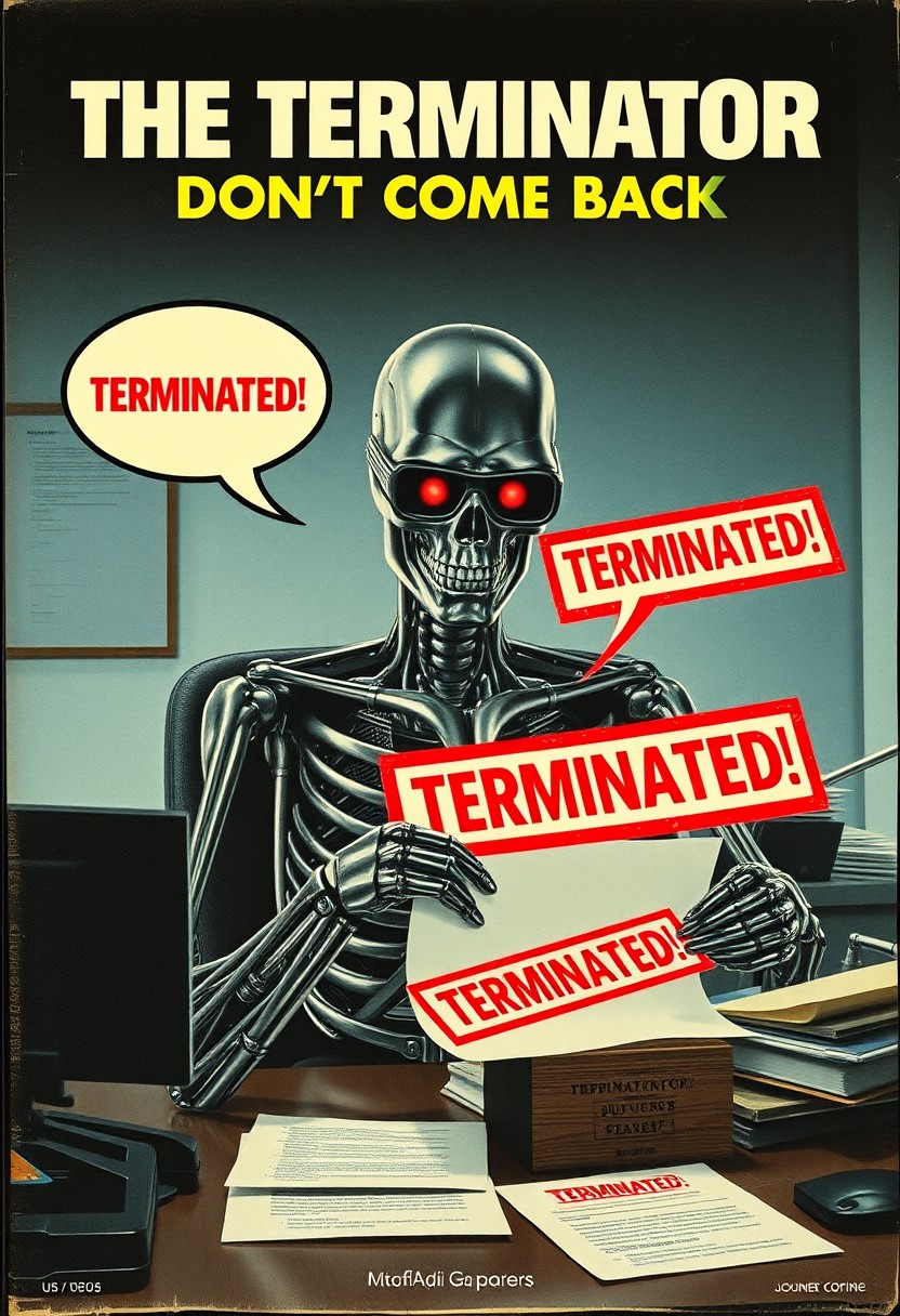 Create a fake B-Movie VHS cover art of a movie called (THE TERMINATOR: DON'T COME BACK) with the title written at the top in the famous Terminator font font, the cover features the iconic Terminator chrome skeleton robot with red glowing eye, but he is sitting behind a office desk in a clean minimalistic 70s office and is wearing ugly glasses as he stamps multiple application papers with a giant red stamp that leaves the word "Terminated!" stamped in red on the papers, he has one big speech bubble that says these exact words ("TERMINATED, TERMINATED, TERMINATED"), dramatic lighting, the cover gives 80s vibes with slightly washed out colors and is despite its silliness very well rendered and extremely detailed.