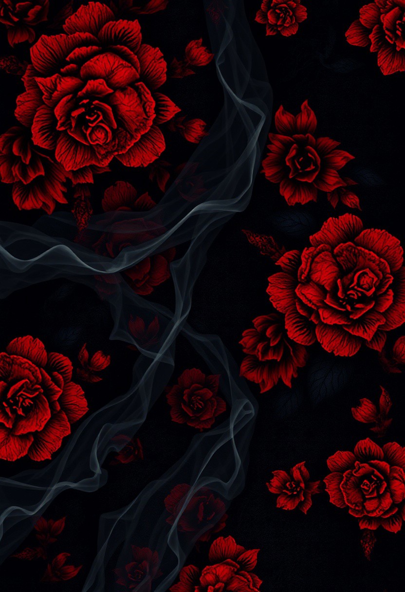 red floral ghostly Halloween spooky wallpaper, intricate patterns, dark gothic elements, high detail, eerie atmosphere, vivid colors, cinematic lighting, digital art, texture-rich, hauntingly beautiful design