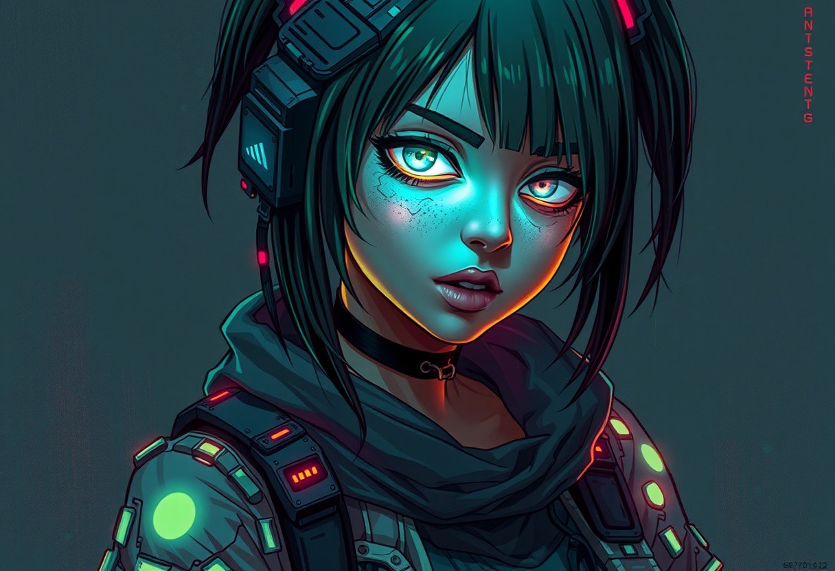 Digital art illustration of a cyberpunk hacker girl with neon glowing body spots and bionic eye, wearing torn clothes and technological gadgets. Introduce neon, dark, worn elements in the aesthetic, nice detail, high quality.