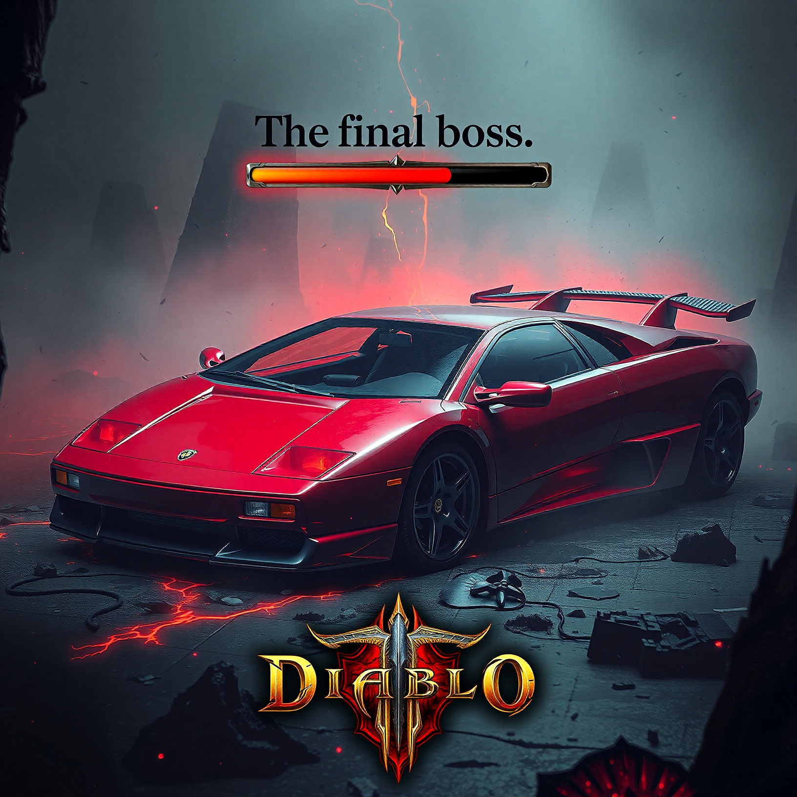 A Lamborghini Diablo VT '95 car stylized as a Diablo 3 final boss. Diablo style health bar at the top of the frame, with a text "The final boss". Diablo 3 logo. Diablo 3 infernal environment, very dim lighting, crawling fog, lavafall.