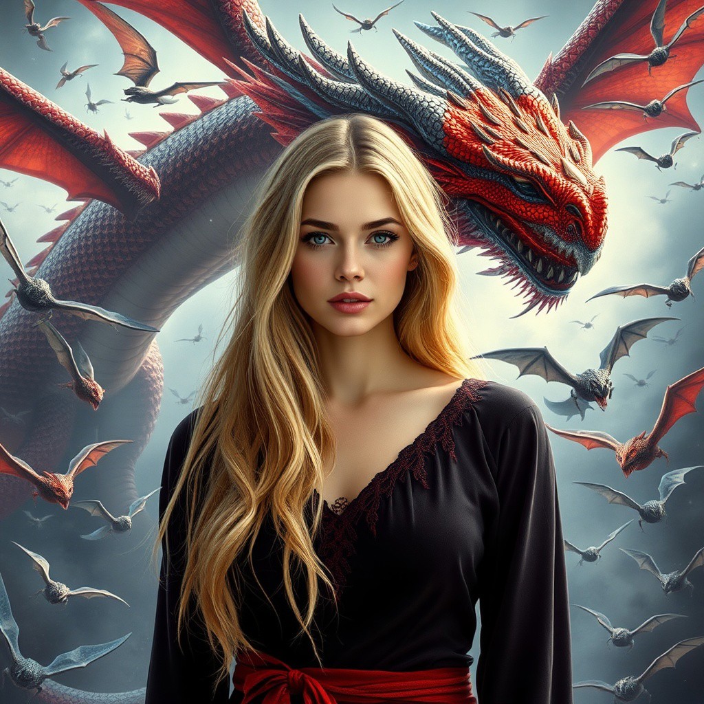a beautifull woman is satanding in front of a dragon , the dragon is red and blue, super focus on female, many baby dragons are flying in the backround, superrealistic, the woman has blond long hair, no makeup