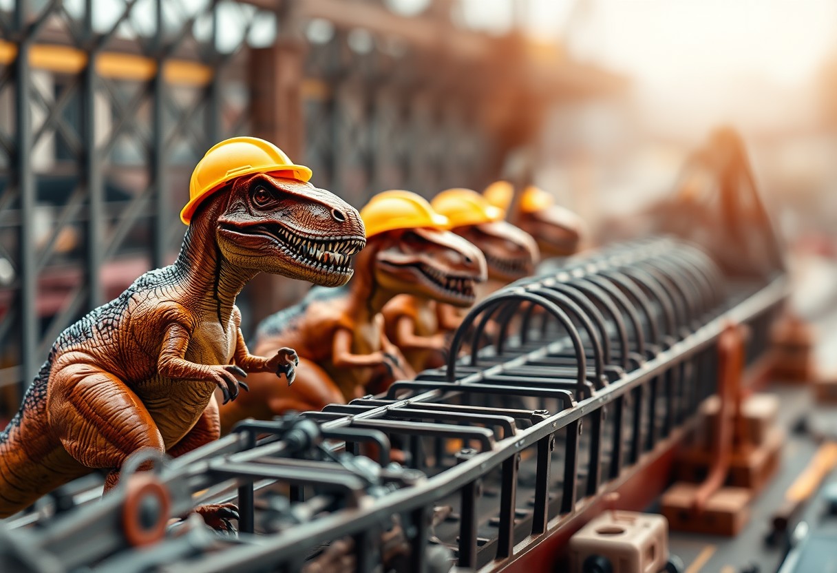 A masterpiece tilt-shift scene, photogenic soft lighting, an extremely detailed diorama photograph with vivid natural colors, showing a bunch of T-rexes dinosaurs building a metal ship at a shipyard Each T-rex is wearing a yellow construction helmet, and they are using their stubby little dinosaur arms to operate the heavy machinery required to build the ship, the ship is still in the early stages of construction consisting of nothing but a structure made from curved metal beams that form the skeleton of the ship, bokeh, depth of field. 4K digital photo quality, bokeh, vivid rich colors, depth of field, extremely detailed background, maximalist, life-like masterpiece realistic photo, hyper-realism, photogenic soft atmosphere, dynamic scene, absurdres, 8k photography, three point perspective, Ultra-realistic, extreme amount of details thay mimic richness of real life