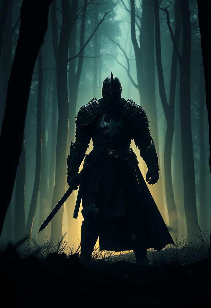 dark silhouette of a warrior in full armor in the forest, ghostly light, tree trunks, a sense of horror and fear epic, cinematic colors, high detailed