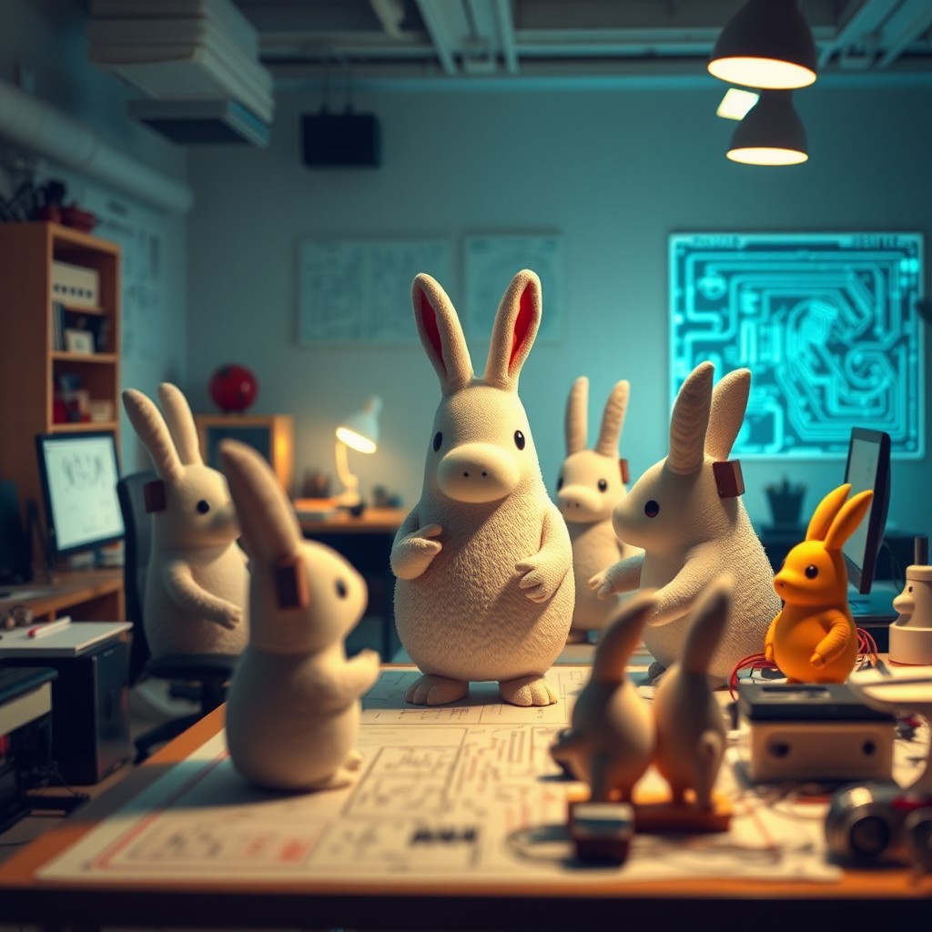 moomin, artistic, masterpiece, design space, office, electronics, circuit, eight moomins, very detailed, abstract objects, well organized space, warm lighting, vibrant colors, blueprint, discussion, design plans, technical drawings, positive vibe,