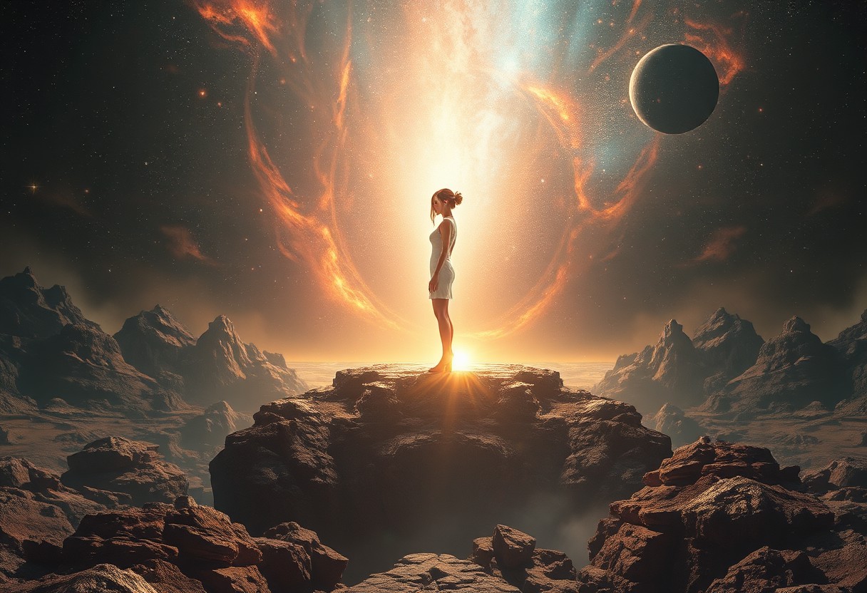 At the end of time, in the deep of space a being of light and magic ponders the universe and births a new reality. Futuristic, Fantastic, beautiful, exotic, magical, surreal, Abstract, absurd,