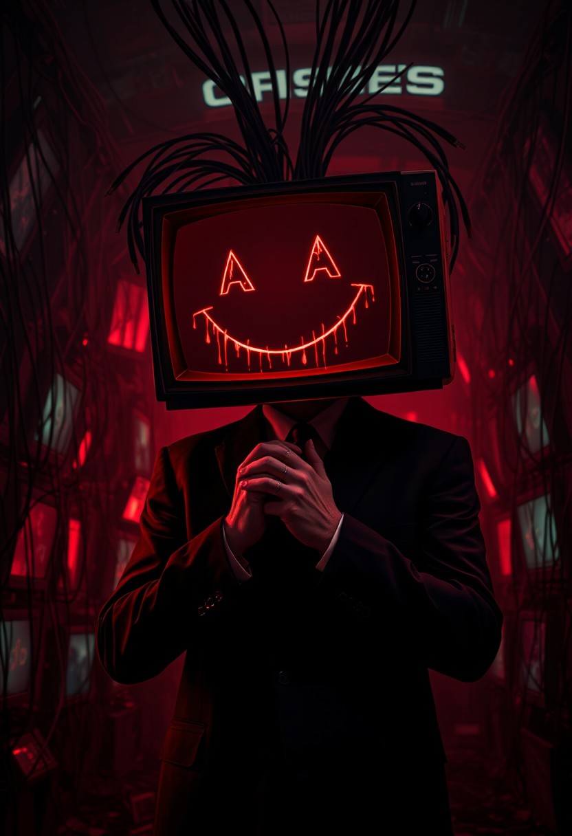 Cinematic, Beauty, Realism, Light and Shadow, Cinematography, Film Stills, A surreal and eerie scene featuring a man with a television as his head, displaying a sinister red smiley face dripping with digital distortion. The figure is dressed in a sharp, dark suit, standing in a dimly lit, dystopian environment. Thick, black cables emerge from the back of the TV head, intertwining with the background's chaotic mess of wires and broken screens, all bathed in an ominous red glow. The hands are clasped together, giving off a menacing yet composed demeanor, as if he is in control of this chaotic digital landscape. The atmosphere is dark, unsettling, and charged with a sense of looming danger. Highest-Quality, 4k, intricate details, visually stunning, Masterpiece