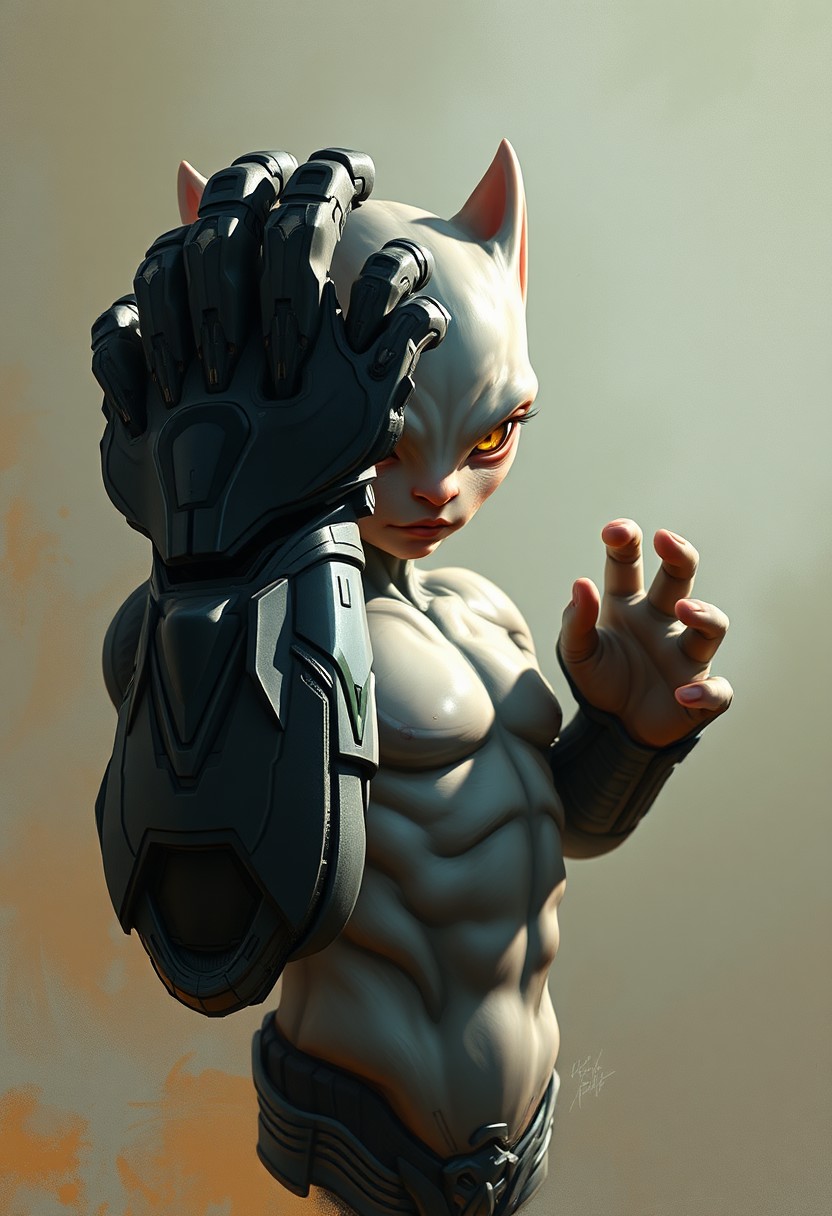 In an intricately detailed digital painting designed for ArtStation and intended as powerful concept art, the subject is a captivating image of a tiny creature wielding a massive, futuristic Power Glove. The bust shot focuses on the creature's striking features: piercing eyes that radiate power, sleek body, and sculpted muscles that hint at hidden strength. The glove itself exudes an air of menacing elegance, with sharp lines and intricate details that highlight its otherworldly design and immense potential for destruction. A sense of dramatic lighting highlights the creature's chiseled features while casting ominous shadows across the canvas, enhancing the overall aura of power and danger emanating from this small but formidable character. The image is rendered in smooth brushstrokes that emphasize both its delicate details and bold composition, making it an ideal piece for use in concept art or digital illustration projects. Octane render, Highest-Quality, 8 k, intricate details, visually stunning, Masterpiece