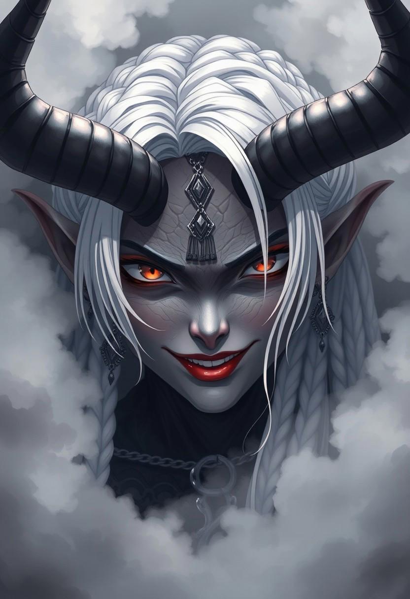 Masterpiece, best quality, UHD, 16k, high res, demon girl face emerges from wall of fog,light black scaly skin, large black horns entwined with silver chains and amulets, sensual lips, a mocking smile, white hair braided into many thin braids, sexy, portrait, anime epic, dynamic colors,