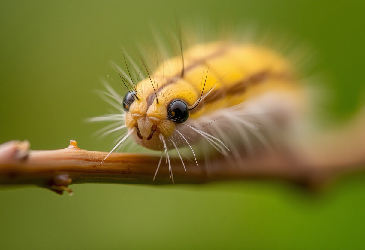 closeup, macro shot, fuzzy_inch-worm, branch, leaf,