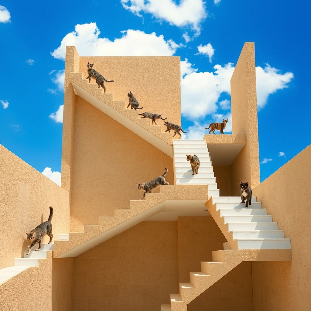 photograph of a surreal impossible construction in the style of M.C. Escher with cats walking on walls and stairs in multiple direction without gravity, the image has no sense of up down left and right, feline walk on the walls ceiling and under stair, the walls are made of sandstone, the stairs of white marble, a bright blue sky with white clouds is showing where an opposite wall would be
