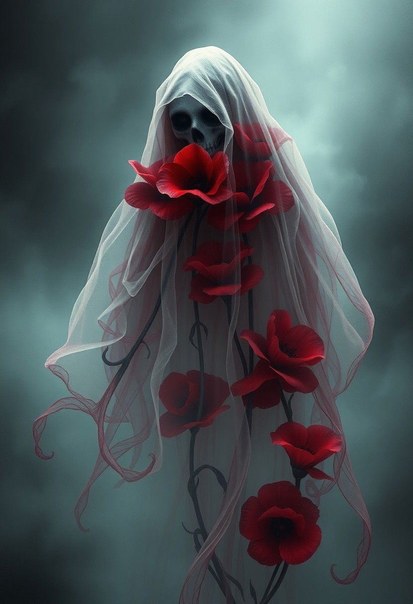 A hauntingly beautiful red floral ghost enveloped in an eerie mist, illustrated in the style of gothic art, intricate details, delicate petals, dark shadows, ethereal atmosphere
