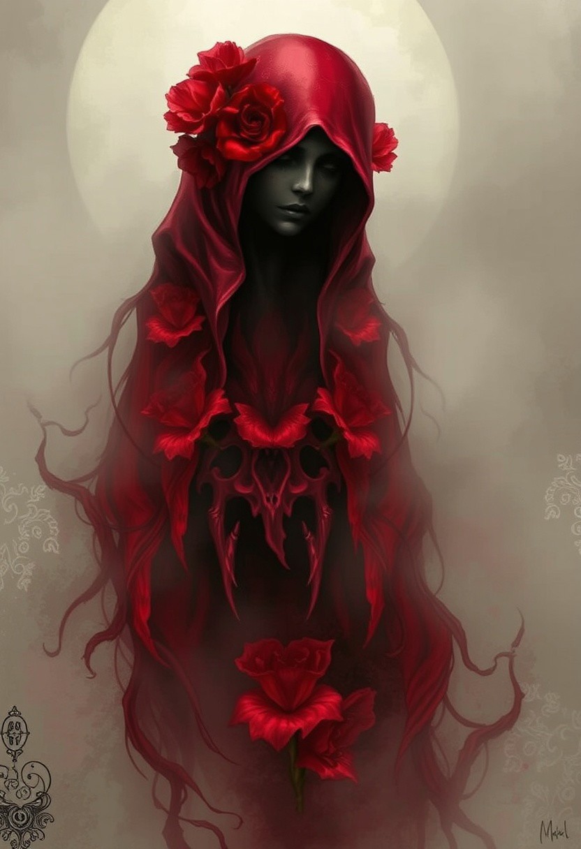 A hauntingly beautiful red floral ghost enveloped in an eerie mist, illustrated in the style of gothic art, intricate details, delicate petals, dark shadows, ethereal atmosphere