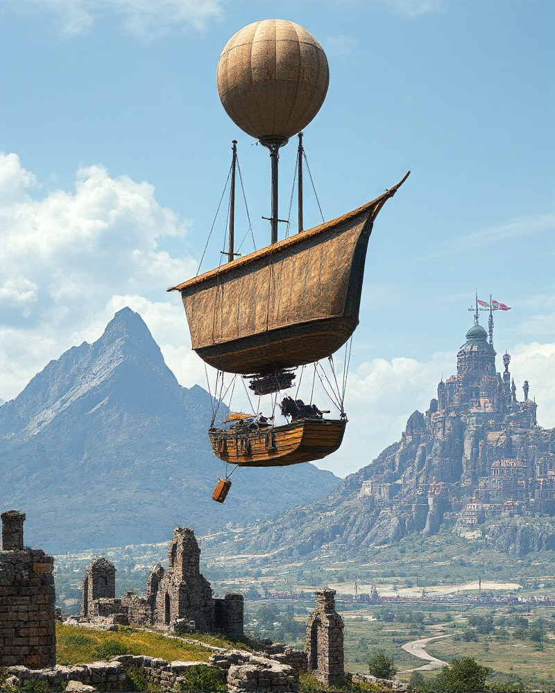 a hyperrealistic image with extreme details of a wooden airship with a balloon, in a steampunk world. The wooden airship is flying over ancient ruins. In the background there is a jagged mountain with a steampunk city on the side displaying an airship dock.