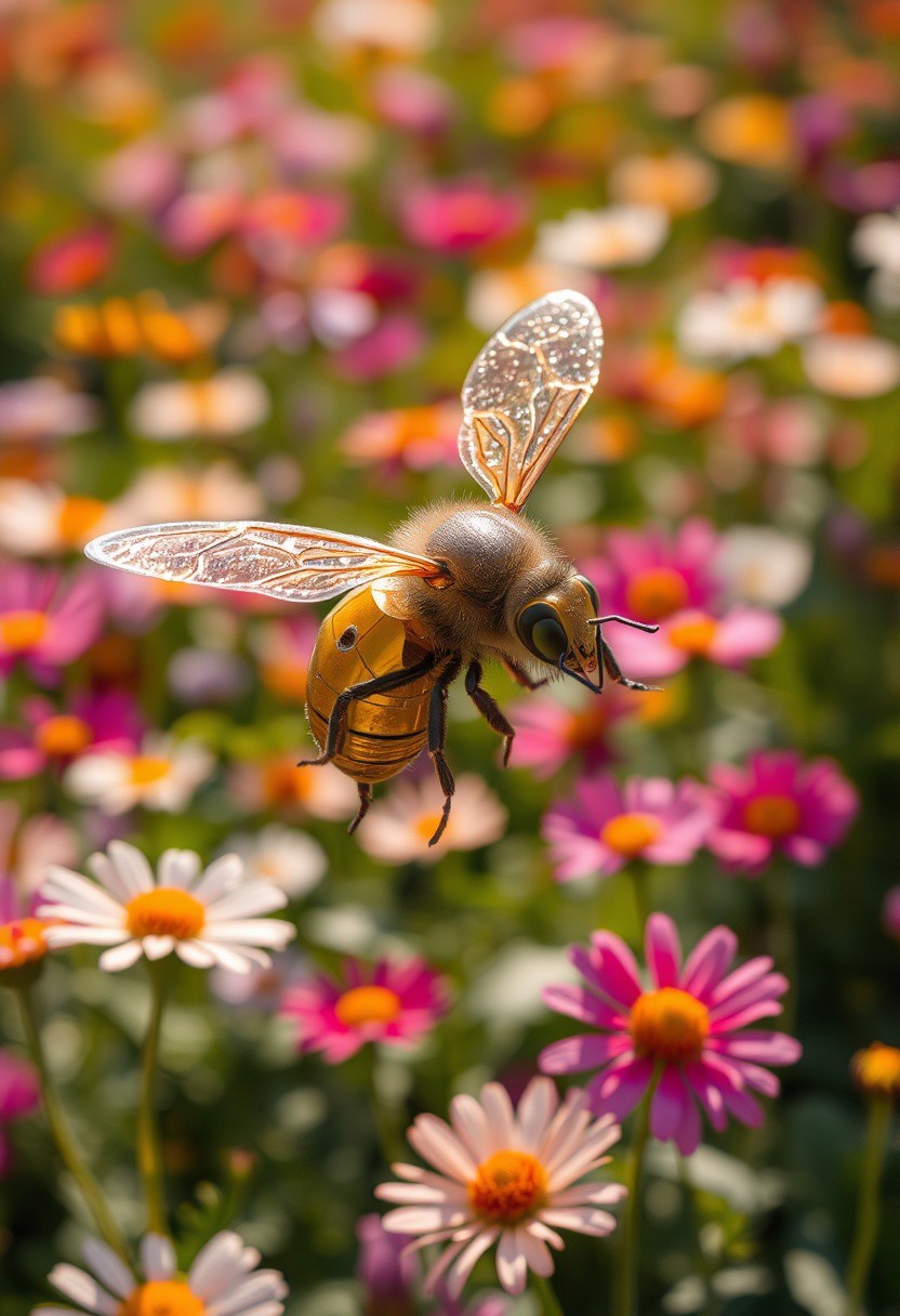 Imagine a close-up of a robotic bee hovering in mid-air, its delicate metal wings shimmering in the sunlight. Surrounding it is a vibrant garden filled with colorful flowers, each petal telling a story of life and beauty. The bee seems to dance gracefully, merging engineering precision with the elegance of nature. In this intersection of technology and the environment, we sense the human desire to harmonize innovation with the natural world.”