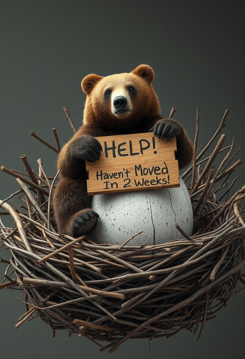 "Create a hyper-realistic image of a bear roosting on a massive egg in a giant nest of intricately woven sticks. The bear sits comfortably on the egg, as if it's a chair, with its paws dangling over the edge. It holds a wooden sign with the message 'Help! I Haven't Moved In 2 Weeks!' scrawled in crude handwriting. The egg, speckled and rough, supports the bear's weight, while the nest's sturdy sticks and twigs seem to be the only thing keeping the bear from tumbling off." Octane render, Highest-Quality, 8 k, intricate details, visually stunning, Masterpiece