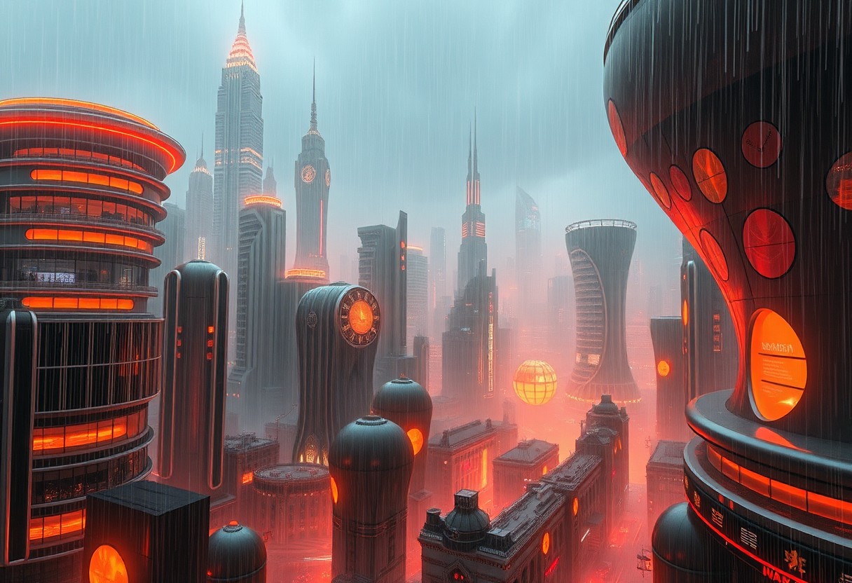 Breathtaking masterwork digital photo, sci-fi city, sleek organic rounded laminate architecture, heavy blinding rainstorm