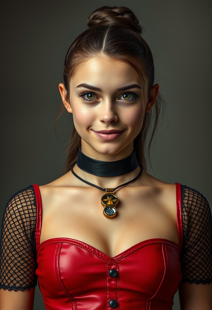photo-realistic and perfectly accurate photo of a young dominatrix with a condescending smile in her face