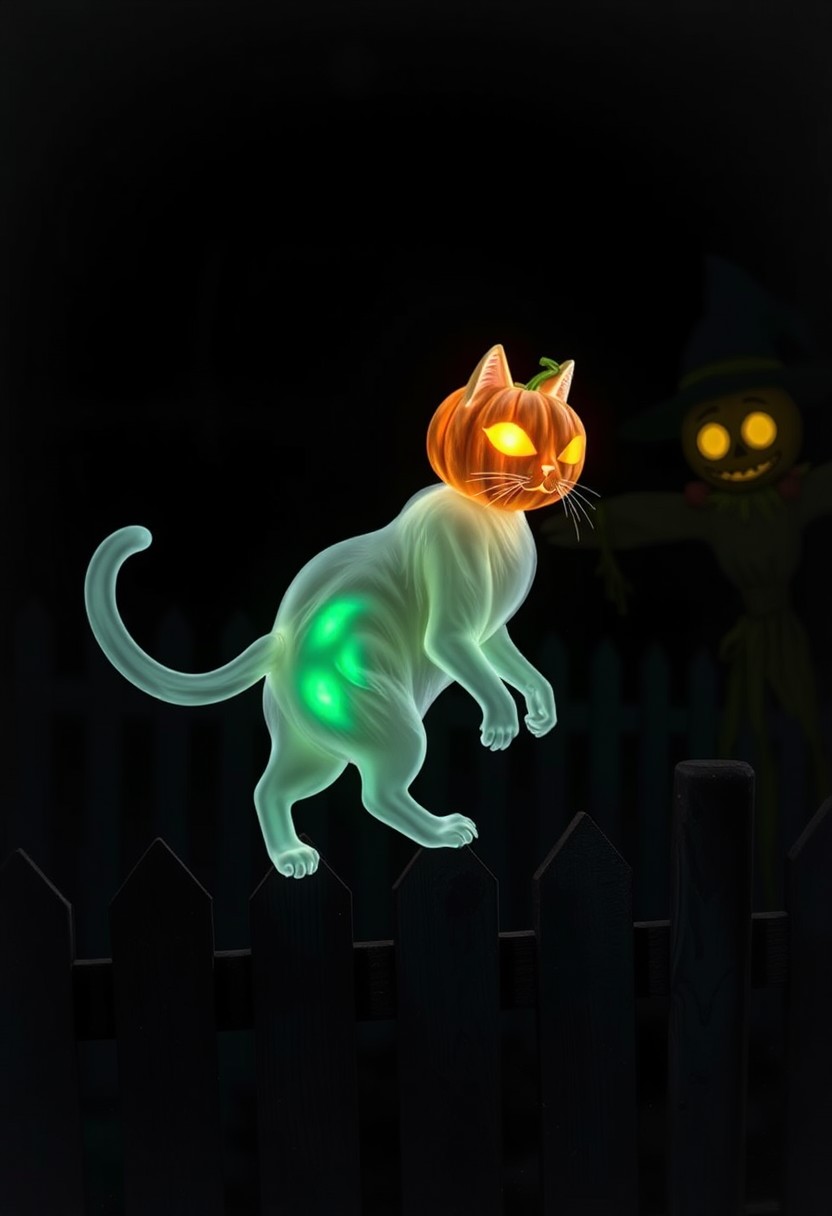 Transparent ghost cat walking on top of fence, with pumpkin instead of head, green light on the tail, scarecrow with glowing eyes in the background, gloomy atmosphere, night,