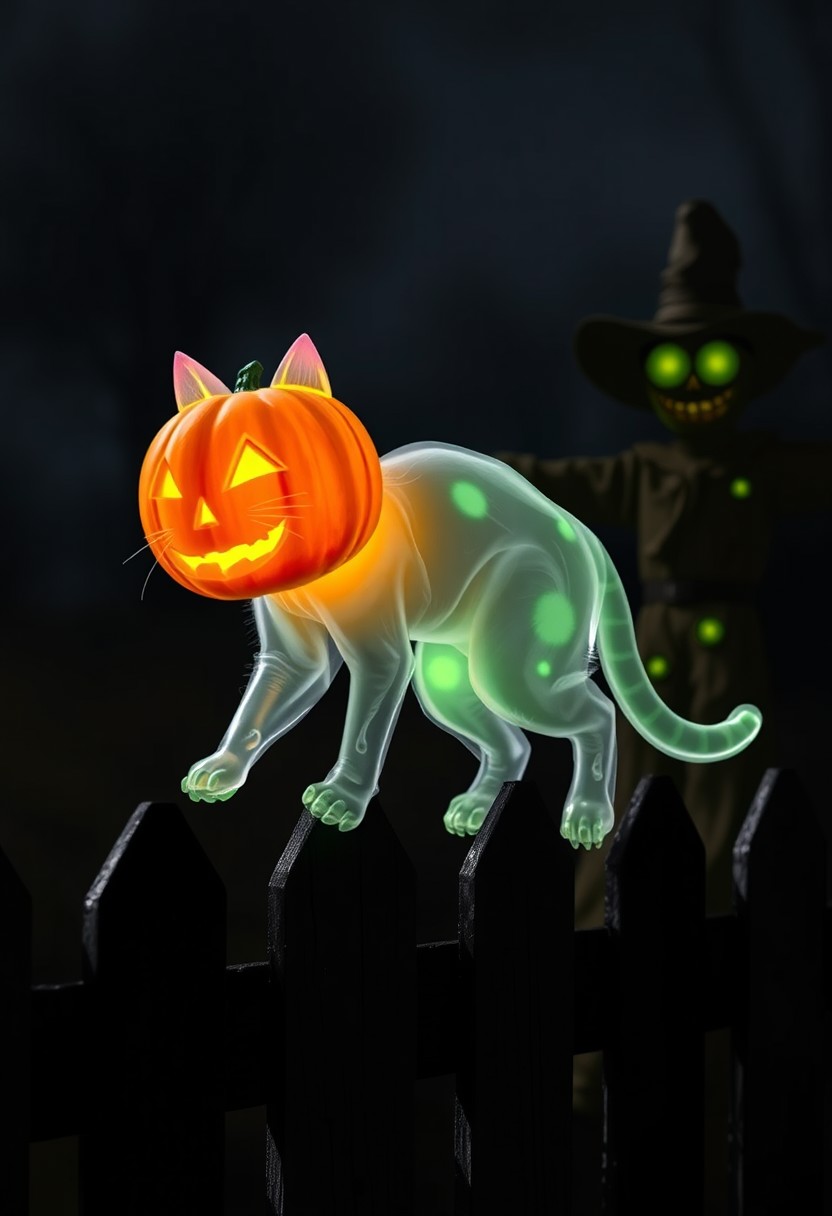 Transparent ghost cat walking on top of fence, with pumpkin instead of head, green light on the tail, scarecrow with glowing eyes in the background, gloomy atmosphere, night,