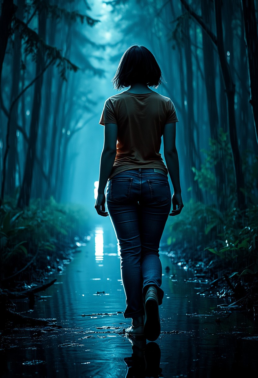 grainy, detailed, dynamic lighting, dark, rain, reflection on water,<lora:Blade Runner 1982:0.8>, curvy girl in jeans and a t shirt with short black hair walking in forest, from behind, bioluminescent details, Shimmering light, thick forest