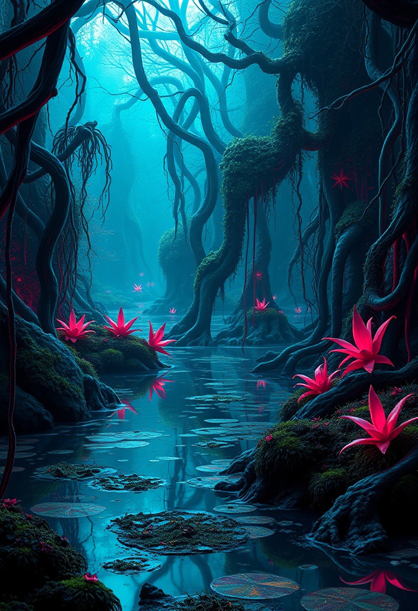 (low quality:-1.2), stark swamp lighting, minimal details, saturated hues, psychedelic tones, multichromatic colors, brutal edges, rigid structure, (polished:-1.3), (noisy:-1.1), (emphasis on sharp geometric forms:1.6), exaggerated features, (overloaded multichromatic colors:1.6), interlocking vines, intricate fractal structures, dystopian vibe, infinite geometry in foliage, (disjointed anatomy:-1.3), unsettling, (bad composition:-1.3), high resolution, vibrant, fractured geometry, fragmented reflections in water, recursive shapes in the landscape, (ugly:-1.3), intersecting planes of water and plants, (smooth surfaces:-1.4), sharp and angular shapes, primal aesthetic, raw, sculptural appearance, unrefined textures, (blurry:-1.2),ruby, fractal patterns in moss, (soft lighting:-1.2), neon glow from bio-luminescent plants, photorealism, (cartoonish:-1.1), (overly ornate:-1.5), swamp, geometric forms