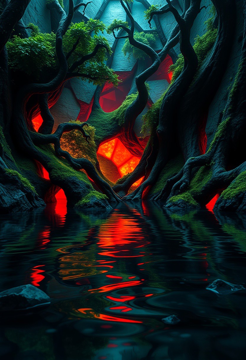 infinite geometry in water reflections, brutal edges, fractal-like ripples, (smooth surfaces:-1.4), smooth yet angular surfaces,gemstone, flowing organic forms, (low quality:-1.2), (bad composition:-1.3), raw, sculptural appearance, (overloaded multichromatic colors:1.6), vibrant, intersecting planes of water, mud, (soft lighting:-1.2), fragmented glowing elements, psychedelic tones, stark swamp lighting, neon glow from bio-luminescent plants, exaggerated features, (blurry:-1.2), saturated hues, (noisy:-1.1), rigid root structures, high resolution, (cartoonish:-1.1), sharp and jagged reflections in murky water, and plants, recursive patterns in moss and water, (rubygemstone:1.5), interlocking vines, dystopian vibe, unsettling, primal aesthetic, minimal details, unrefined textures, flowing organic geometry, (polished:-1.3), (disjointed anatomy:-1.3), intricate fractal structures in vegetation, (overly ornate:-1.5), photorealism, multichromatic colors, swamp, (ugly:-1.3)